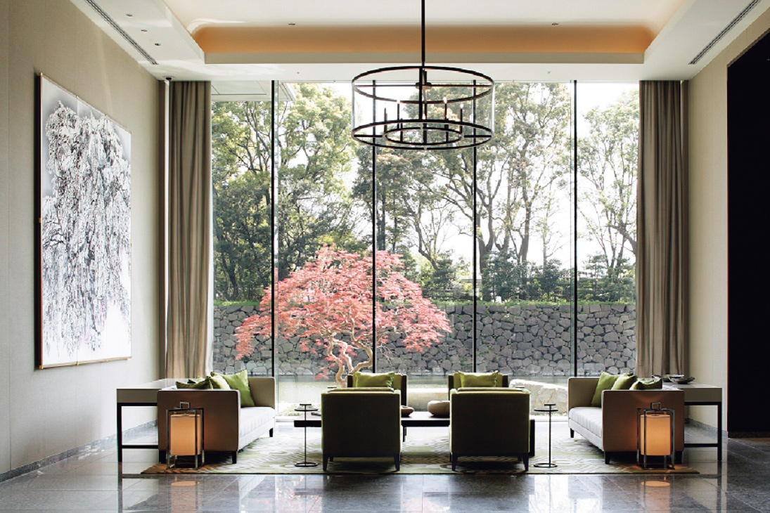 天井高6mのロビーの窓が切り取る景色は、まるで絵画作品のよう。シンボルの手向山紅葉はあえて窓の左寄りに配することで日本独特の余白の美が表現されている。ロビーラウンジ 「ザパレス ラウンジ」とオールデイダイニング 「グランドキッチン」は、どちらも窓外に皇居外苑の緑が広がるくつろぎの空間。テラスの前のお濠には白鳥が現れることもある。香り高いお茶や料理を味わい、やすらぎのひとときを。